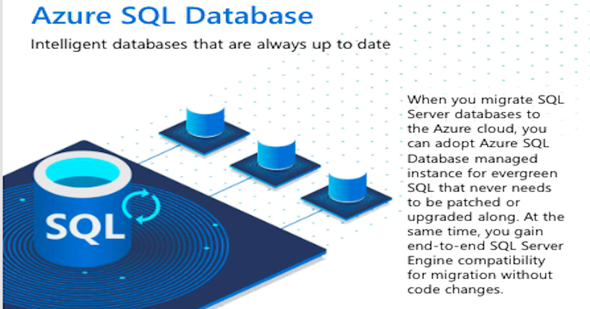 Azure SQL databases are always up-to-date. When you migrate SQL Server databases to the Azure cloud, you can adopt Azure SQL Database managed instance for evergreen SQL that never needs to be patched or upgraded along. At the same time, you gain end-to-end SQL Server Engine compatibility for migration without code changes.