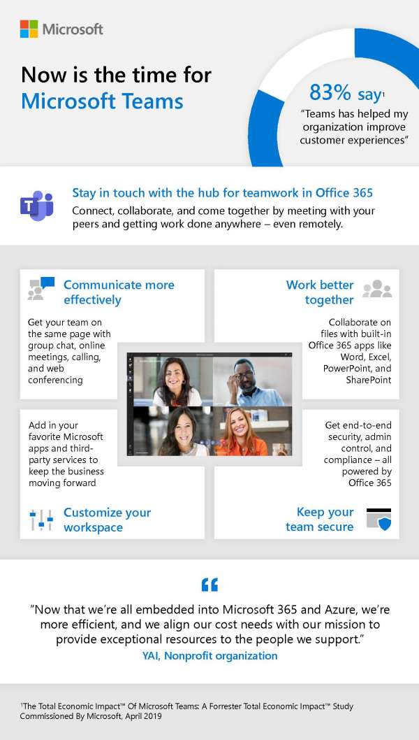 This infographic outlines how you can stay in touch with the hub for teamwork in Office 365. With Microsoft Teams you can connect, collaborate, and come together securely by meeting with your peers and getting work done anywhere—even remotely.
